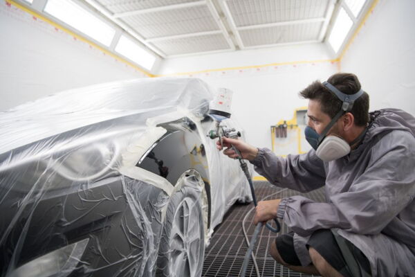 Das Aufbringen des Lacks erfolgt in der staubfreien Spritzkabine. Danach wird die neue Farbe mit bis zu 70° eingebrannt.